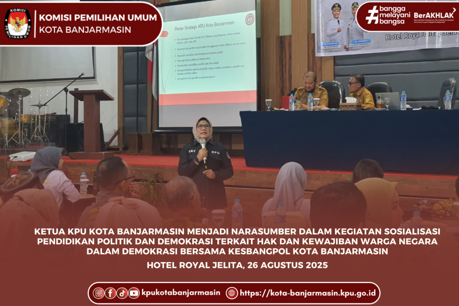 Ketua KPU Kota Banjarmasin Ibu Drs. Hj. Rusnailah, M.Pd menjadi salah satu Narasumber dalam Kegiatan Sosialisasi Pendidikan Politik dan Demokrasi "Hak dan Kewajiban Warga Negara Dalam Demokrasi" yang dilaksanakan oleh Kesbangpol Kota Banjarmasin. (26/08/2025) Kegiatan Sosialisasi ini dilaksanakan atas program kegiatan Badan Kesatuan Bangsa dan Politik Kota Banjarmasin Tahun 2025. Kegiatan tersebut dilaksanakan di Hotel Royal Jelita Banjarmasin pada hari Selasa tanggal 26 Agustus 2025. Dihadiri oleh beberapa narasumber yaitu Kepala Bakesbangpol Kota Banjarmasin Bapak Dr. H. Lukman Fadlun, SH, MH, Ketua KPU Kota Banjarmasin Drs. Hj Rusnailah, M.Pd dan Dosen Fakultas Ilmu Administrasi Publik Bapak Junaidy, S.Sos., M.AB.,M.I.Kom. Peserta Kegiatan terdiri dari beberapa organisasi masyarakat. ....