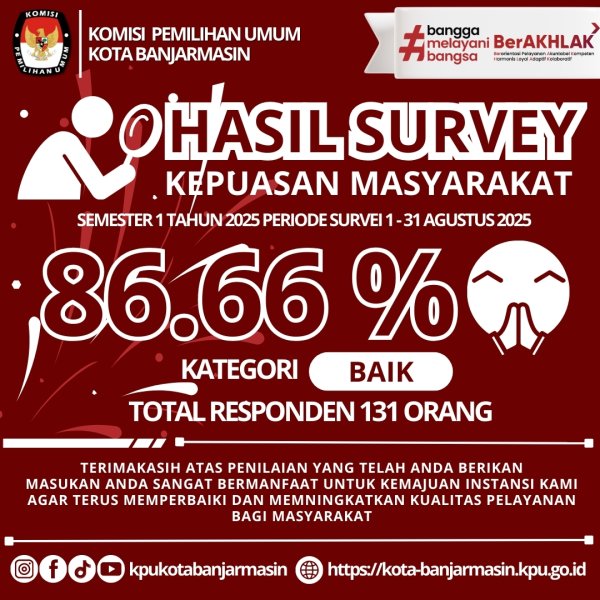 KPU Kota Banjarmasin telah melaksanakan Survei Kepuasan Masyarakat (SKM) Semester 1 tahun 2025 di Lingkungan KPU Kota Banjarmasin untuk pemenuhan Indeks Kepuasan Masyarakat (IKM) pada pelaksanaan Evaluasi Reformasi Birokrasi KPU Tahun 2025. Hasil Survei Kepuasan Masyarakat (SKM) Semester 1 Tahun 2025 periode survei 1 - 31 Agustus 2025 mendapatkan 86, 66% dengan Predikat Kategori BAIK ( Total Responden 131 Orang ). Terimakasih atas Penilaian yang telah Anda berikan, masukkan Anda sangat bermanfaat untuk kemajuan Instansi kami agar terus memperbaiki dan meningkatkan kualitas pelayanan bagi masyarakat. Salam Melayani, KPU Kota Banjarmasin. ....