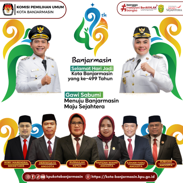 Seluruh jajaran KPU Kota Banjarmasin mengucapkan Selamat Hari Jadi ke-499 Kota Banjarmasin (24 September 1526 – 24 September 2025). Semoga Kota Banjarmasin pada usia ke-499 ini semakin maju, damai, dan sejahtera. Dengan semangat “Gawi Sabumi”, mari kita terus bergotong royong menjaga persatuan, memperkuat keamanan, serta meningkatkan pelayanan terbaik bagi warga Kota Banjarmasin tercinta. ....