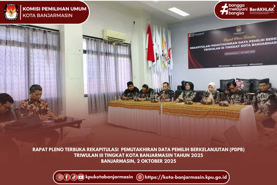 Hai #TemanPemilih, KPU Kota Banjarmasin telah melaksanakan Rapat Pleno Terbuka Rekapitulasi Pemutakhiran Dara Pemilih Berkelanjutan (PDPB) Tingkat Kota Banjarmasin Triwulan III Tahun 2025 pada hari ini Kamis tanggal 2 Oktober 2025 pada pukul 10.00 WITA yang telah dihadiri oleh Kepala Polresta Banjarmasin, Kodim 1007 Kota Banjarmasin, Ketua Bawaslu Kota Banjarmasin, Kepala Badan Kesbangpol Kota Banjarmasin, Kepala Dinas Kependudukan dan Pencatatan Sipil Kota Banjarmasin, Kepala Lembaga Permasyarakatan Kelas IIA Banjarmasin. Pelaksanaan PDPB ini dilaksanakan bertujuan untuk : Memelihara dan memperbaharui DPT Pemilu dan/atau Pemilihan terakhir secara berkelanjutan untuk penyusunan DPT pada Pemilu dan/atau Pemilihan berikutnya dengan tetap menjamin kerahasiaan data; dan menyediakan data dan informasi Pemilih berskala nasional mengenai Data Pemilih secara komprehensif, akurat, dan mutakhir. Sasaran PDPB merupakan WNI yang berdomisili di wilayah Negara Kesatuan Republik Indonesia dan/atau di Luar Negeri yang memenuhi persyaratan : berusia genap 17 (tujuh belas) tahun atau lebih, sudah kawin atau sudah pernah kawin yang dibuktikan dengan KTP-el, KK, biodata penduduk, atau IKD; tidak sedang dicabut hak politiknya berdasarkan putusan pengadilan yang telah mempunyai kekuatan hukum tetap; dan tidak sedang menjadi prajurit Tentara Nasional Indonesia atau anggota Kepolisian Negara Republik Indonesia. WNI yang pindah ke luar dari domisilinya dilakukan pendataan pada tempat domisili terakhir sesuai dengan alamat pada tempat domisili terakhir sesuai dengan alamat pada KTP-al, KK, Biodata Penduduk, IKD, dan/atau paspor. Dalam penyelenggaraan PDPB, KPU Kabupaten/Kota wajib: a. melakukan pengawasan terhadap pengolahan dan pengelolaan data pribadi; b. melakukan evaluasi dan pengendalian terhadap penyelenggaraan PDPB di wilayah kerjanya; c. melindungi dan menjaga kerahasiaan data pribadi; d. mengelola, mengamankan, dan menyajikan Data Pemilih berskala kabupaten/kota; e. menyampaikan laporan PDPB tingkat kabupaten/kota kepada KPU Provinsi; f. menindaklanjuti laporan dan pengaduan masyarakat; dan g. menindaklanjuti hasil pengawasan Bawaslu Kabupaten/Kota atas PDPB. ....