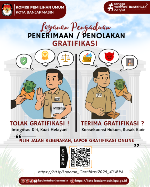 Hai #TemanPemilih, Mari bersama-sama berperan aktif dalam melawan gratifikasi dengan melaporkan penerimaan atau penolakan gratifikasi melalui layanan pengaduan resmi. Jangan ragu untuk melapor, karena integritas dimulai dari keberanian! Bersama kita wujudkan KPU yang bersih dan berintegritas. Pelaporan dapat meakses qr code yang telah tersedia maupun meakses link https://bit.ly/Laporan_Gratifikasi2025_KPUBJM #TolakGratifikasi #LaporGratifikasi #IntegritasTanpaBatas #AntiGratifikasi ....