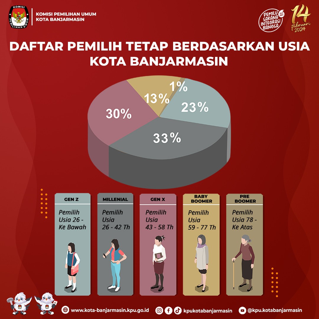 Berikut adalah hasil rekapitulasi Daftar Pemilih Tetap (DPT) berdasarkan usia tingkat Kota Banjarmasin yang telah ditetapkan pada tanggal 20 Juni 2023 kemarin.