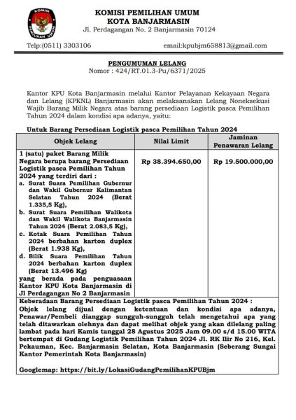 Pengumuman Lelang Ulang Barang Persediaan Logistik Pasca Pemilihan Tahun 2024 pada KPU Kota Banjarmasin