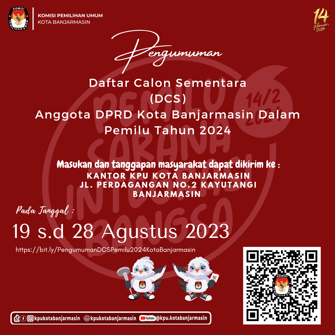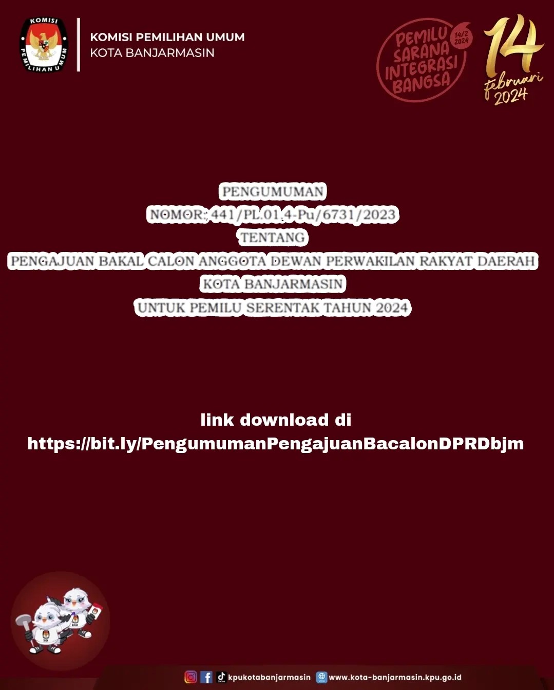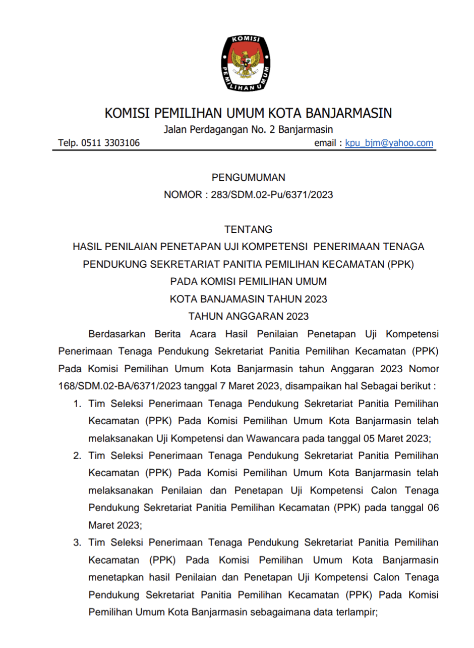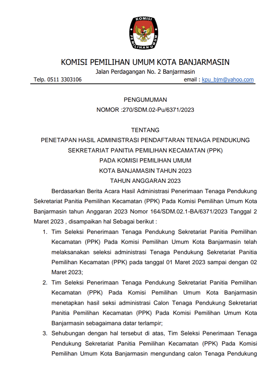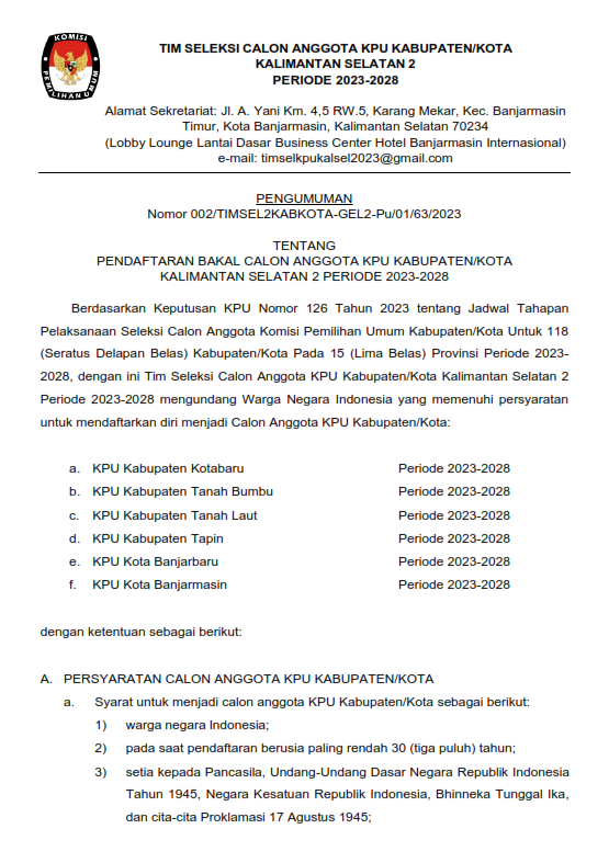 Berikut Pengumuman Nomor 002/TIMSEL2KABKOTA-GEL2-Pu/01/63/2023 Tentang Pendaftaran Bakal Calon Anggota KPU Kabupaten/Kota Kalimantan Selatan 2 Periode 2023-2028