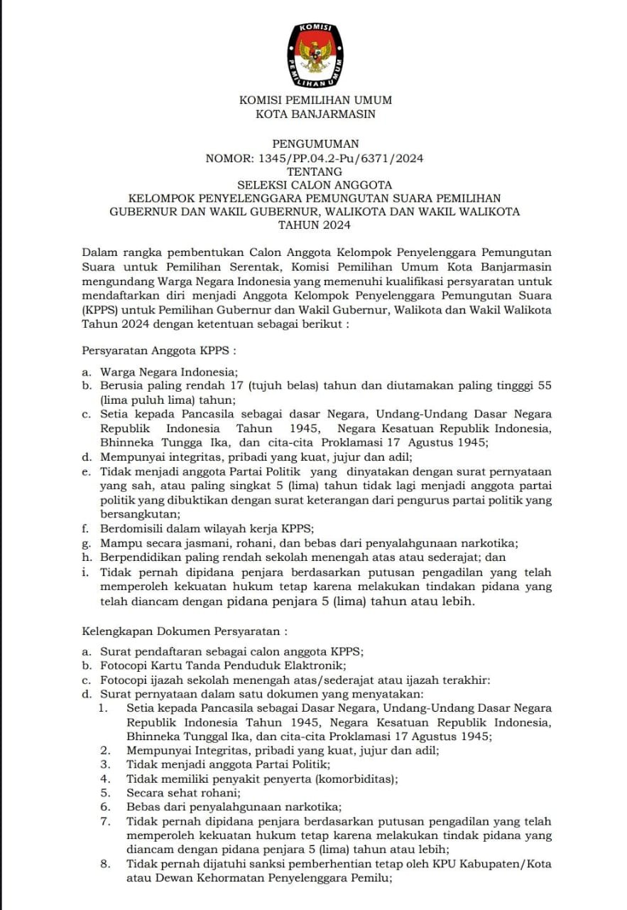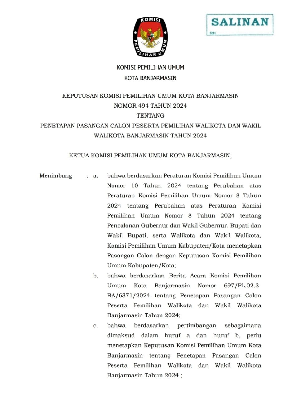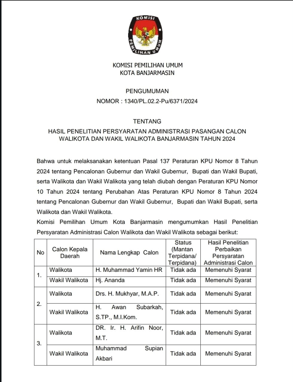 KPU Kota Banjarmasin Menerbitkan Pengumuman Nomor : 1340/PL.02.2-Pu/6371/2024 Tentang Hasil Penelitian Persyaratan Administrasi Pasangan Calon Walikota Dan Wakil Walikota Banjarmasin Tahun 2024