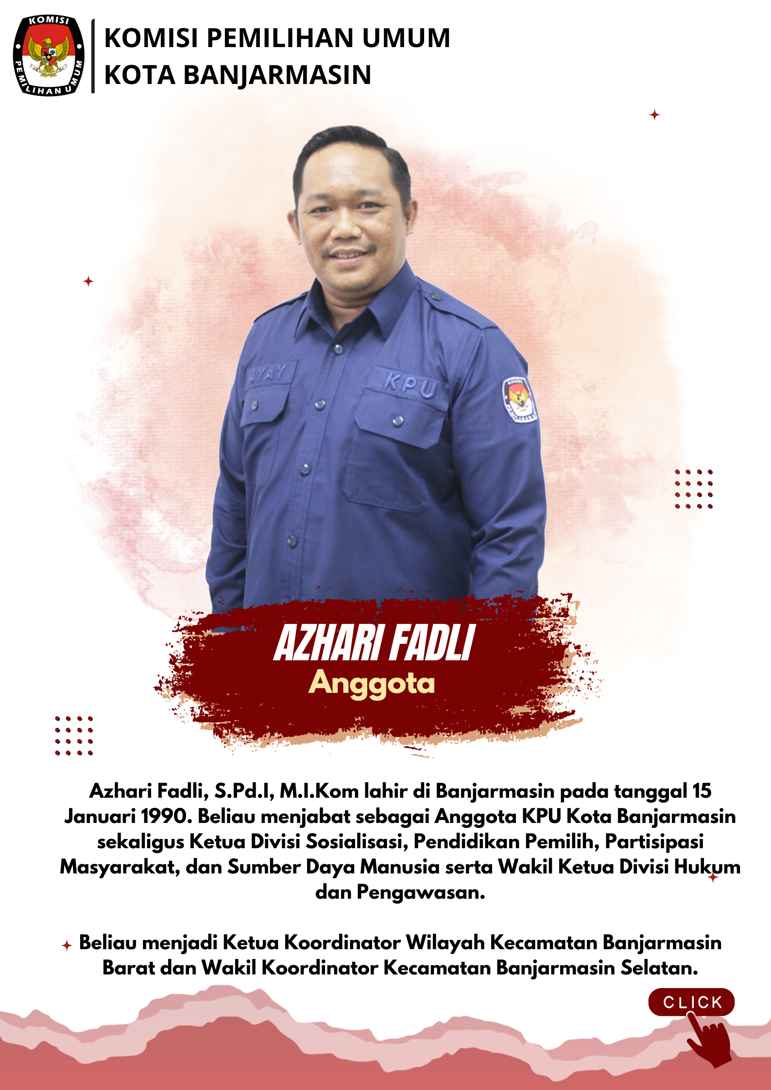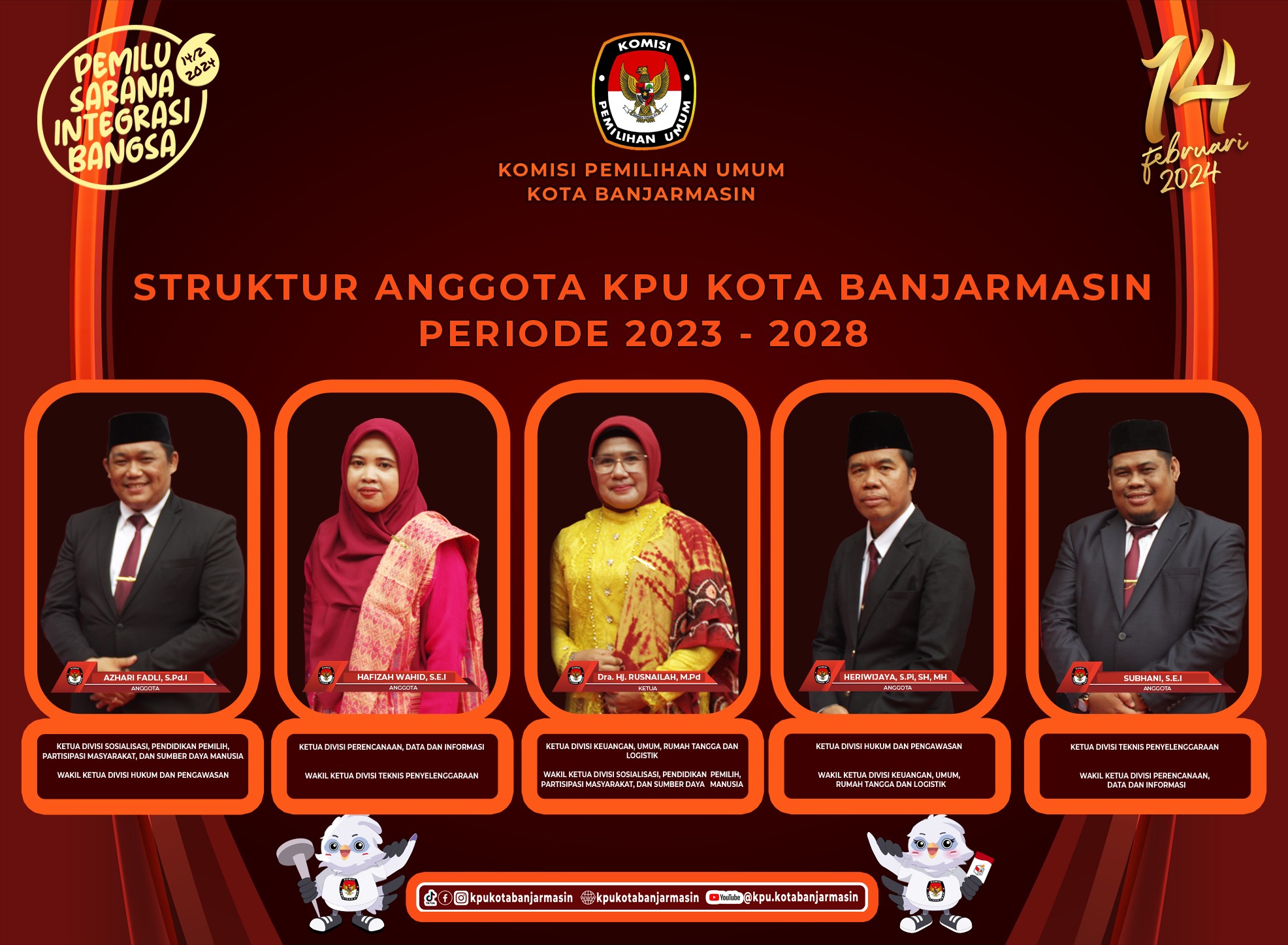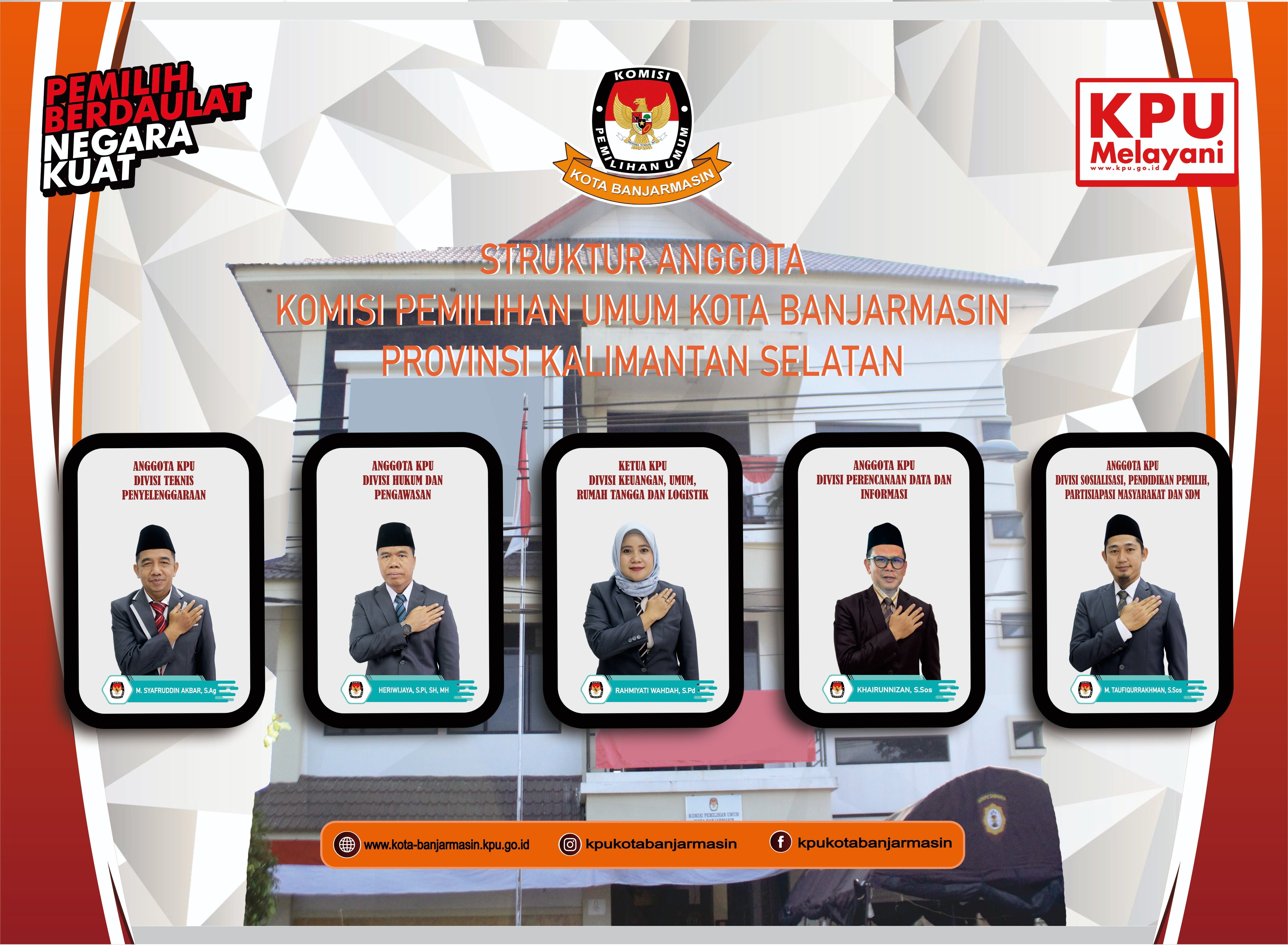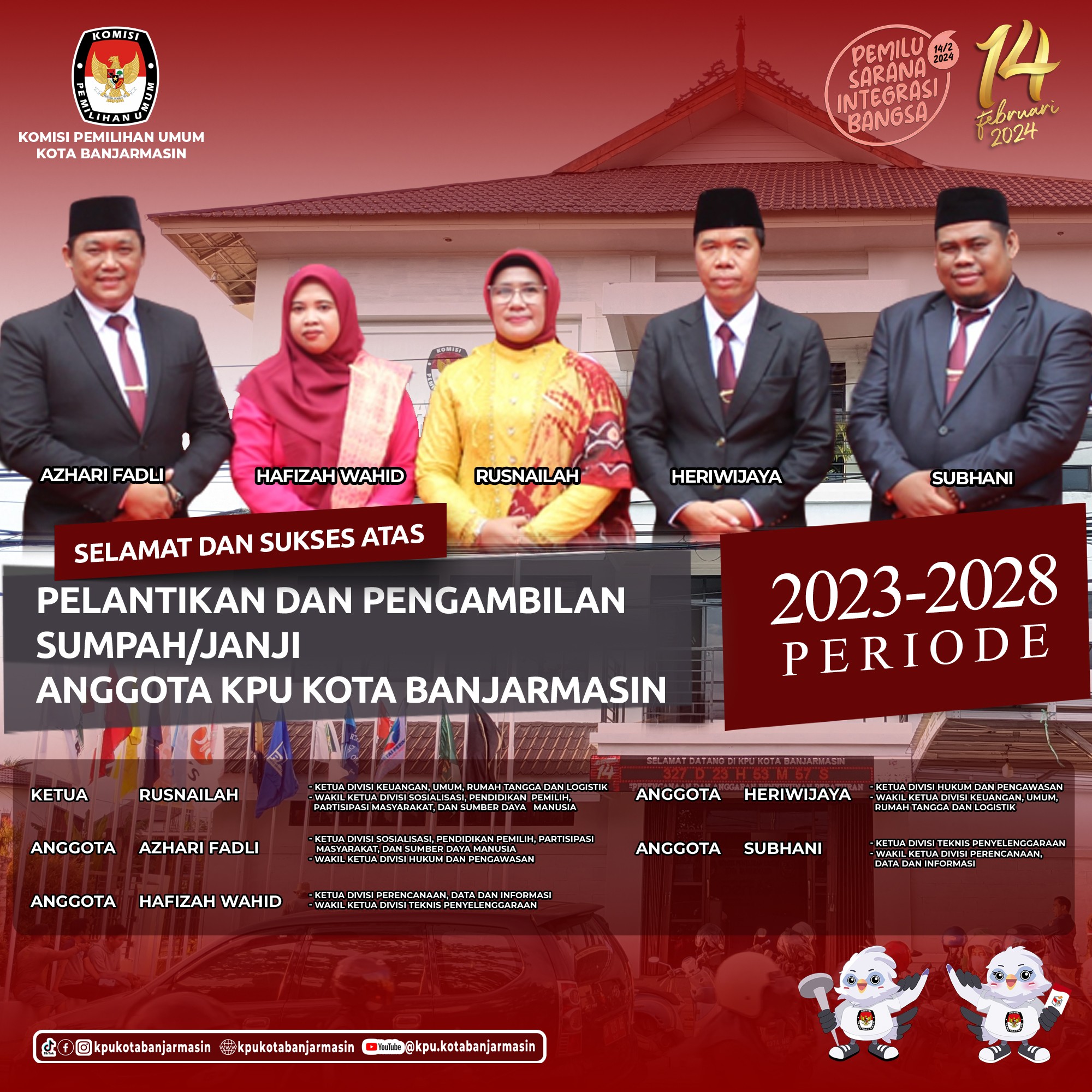Profil Anggota KPU ANGGOTA KOMISI PEMILIHAN UMUM KOTA BANJARMASIN PERIODE 2023-2028 PROFIL KETUA, ANGGOTA DAN SEKRETARIS KPU KOTA BANJARMASIN ANGGOTA KOMISI PEMILIHAN UMUM KOTA BANJARMASIN PERIODE 2018 - 2023 Share this artikel : Dilihat 2,035 Kali.