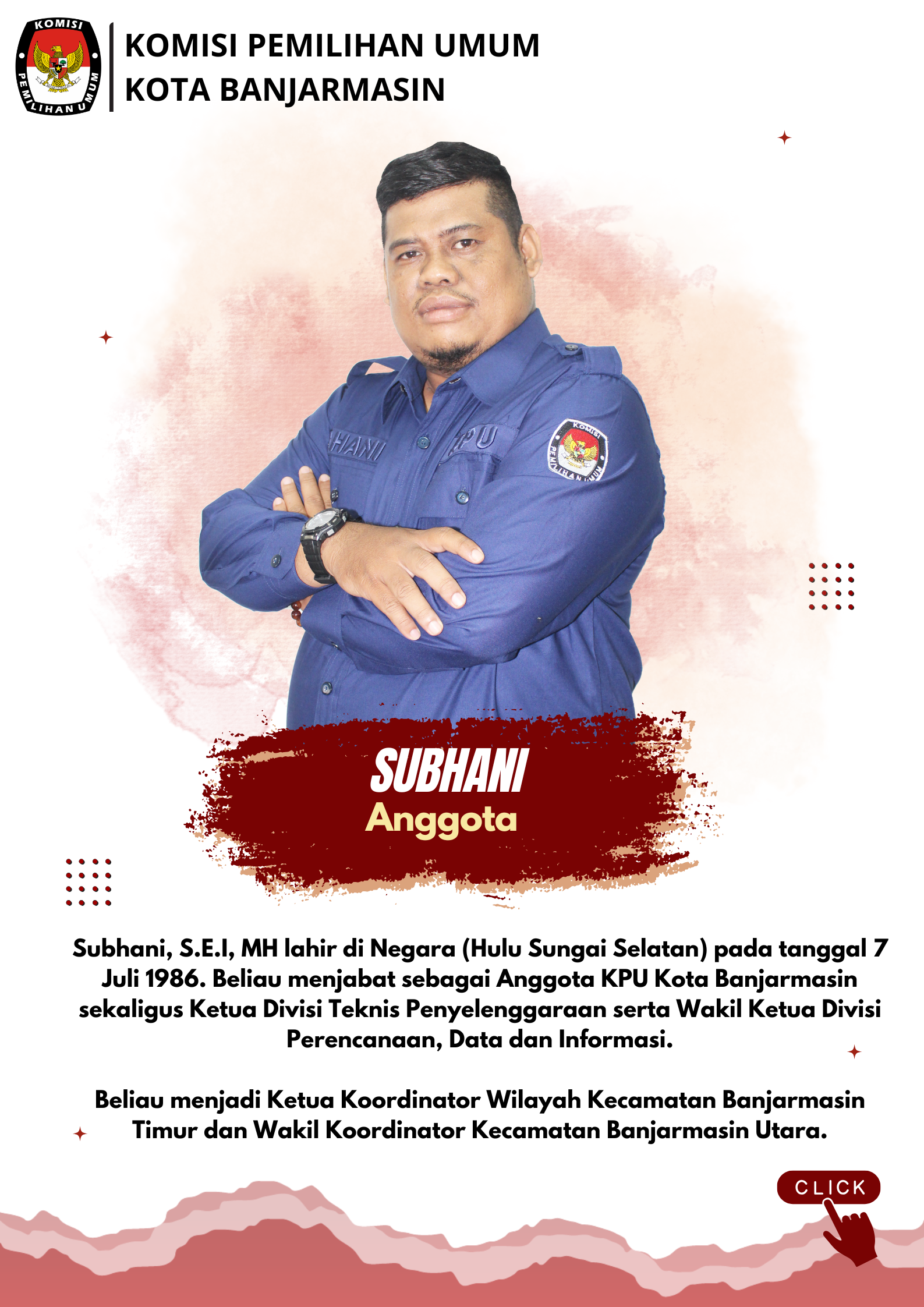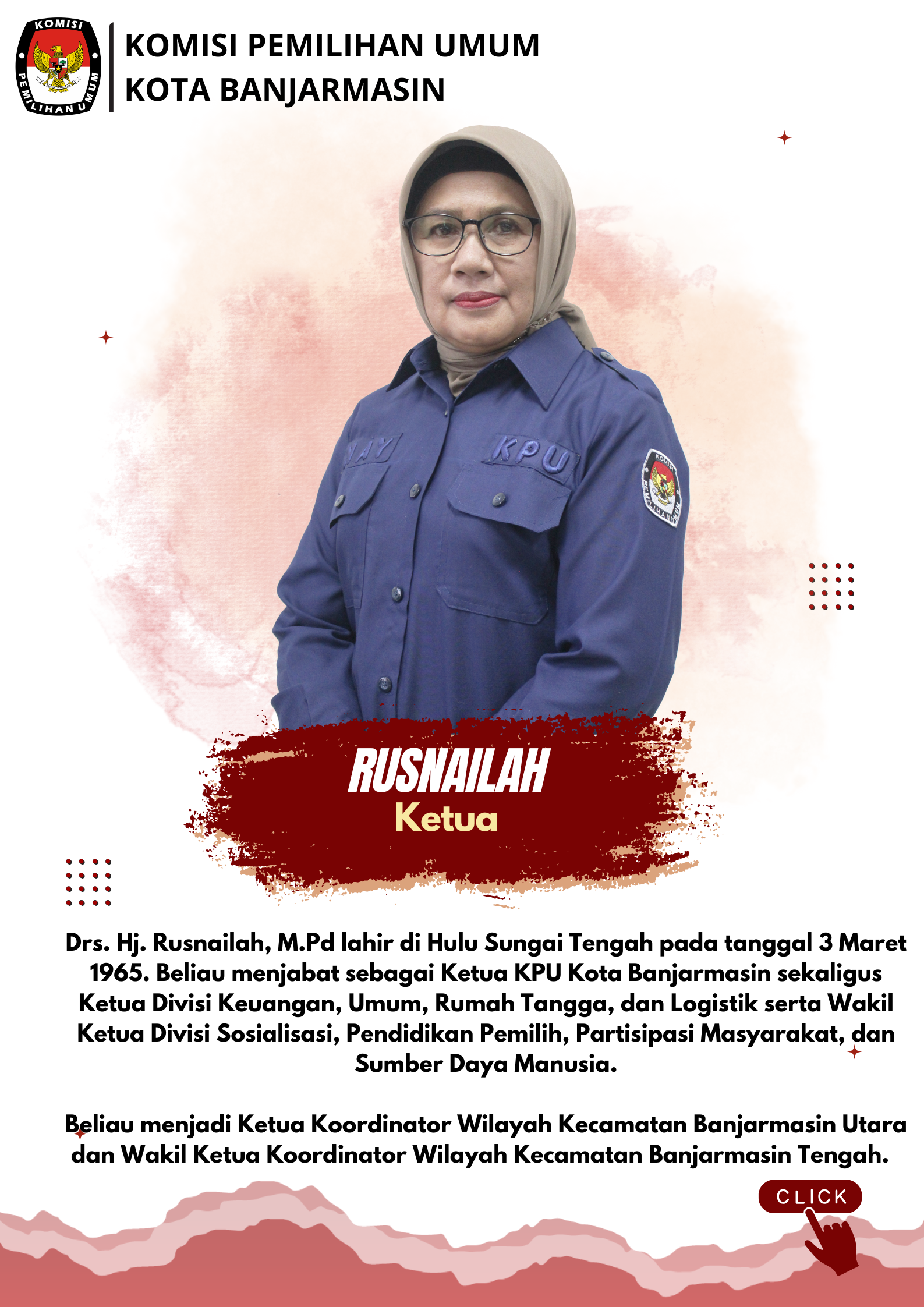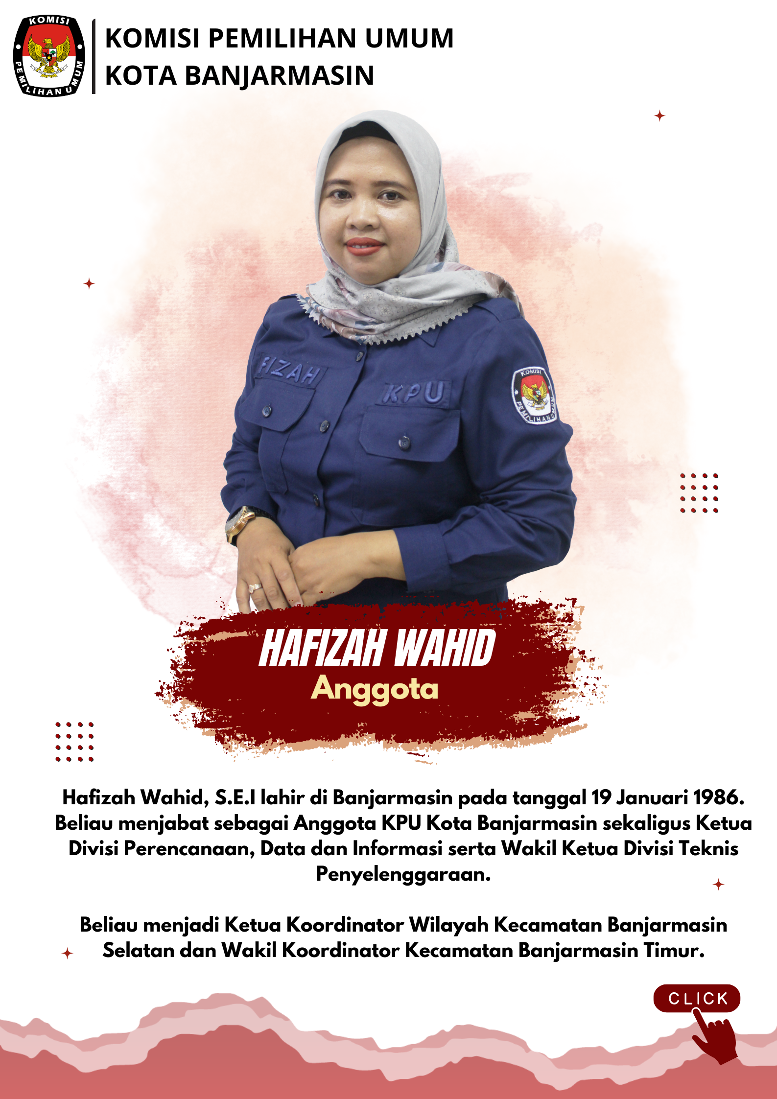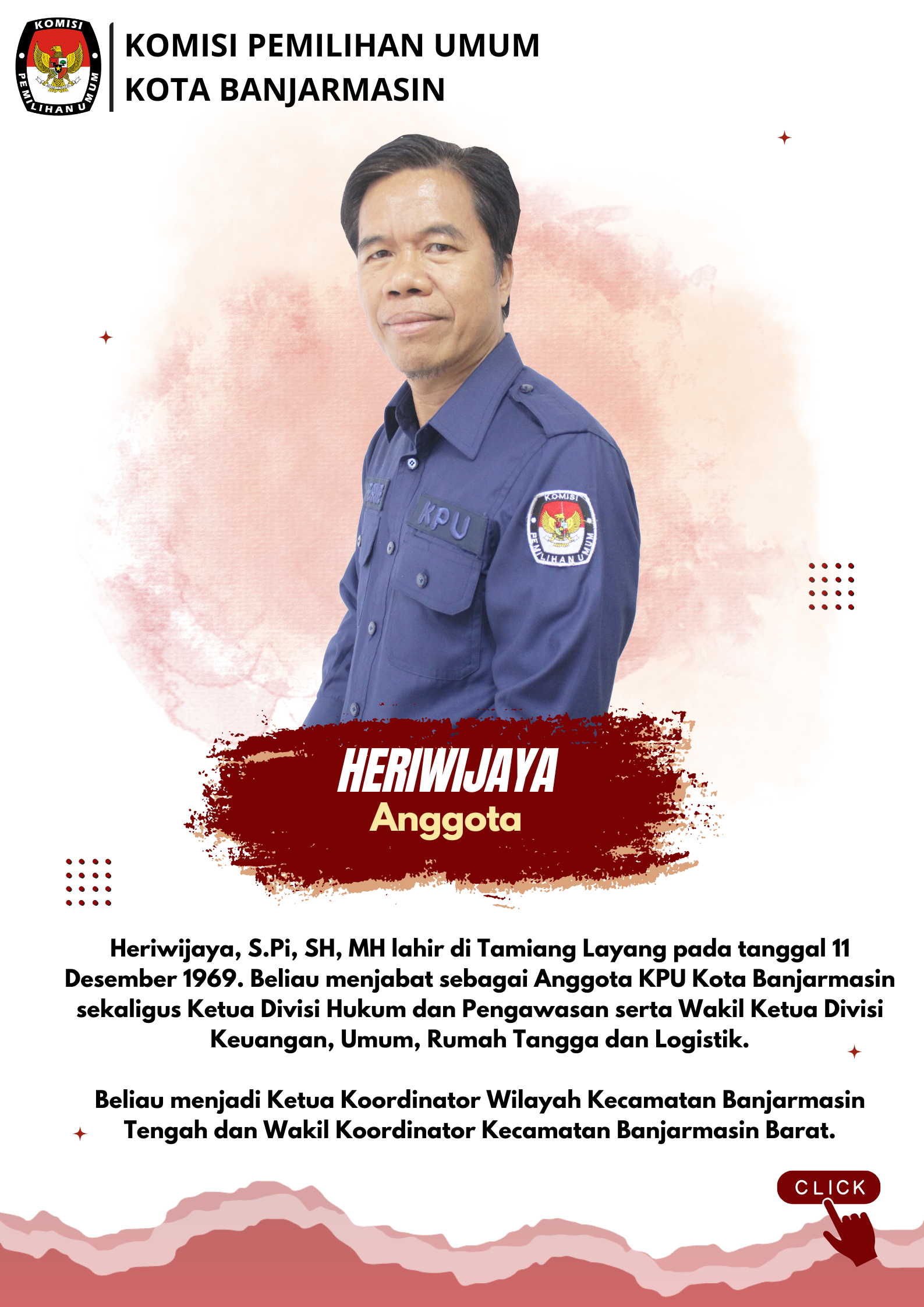 Profil Anggota KPU ANGGOTA KOMISI PEMILIHAN UMUM KOTA BANJARMASIN PERIODE 2023-2028 PROFIL KETUA, ANGGOTA DAN SEKRETARIS KPU KOTA BANJARMASIN ANGGOTA KOMISI PEMILIHAN UMUM KOTA BANJARMASIN PERIODE 2018 - 2023 Share this artikel : Dilihat 2,035 Kali.