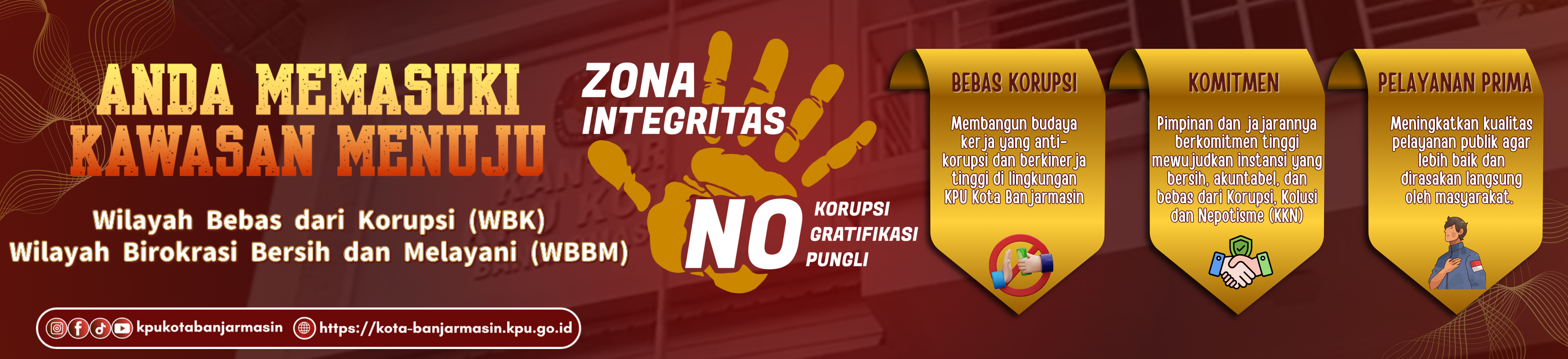 Pembangunan Zona Integritas (ZI) di lingkungan KPU Kota Banjarmasin merupakan komitmen kelembagaan dalam mewujudkan tata kelola pemerintahan yang bersih, transparan, dan akuntabel guna mendukung penyelenggaraan pemilu yang berintegritas.